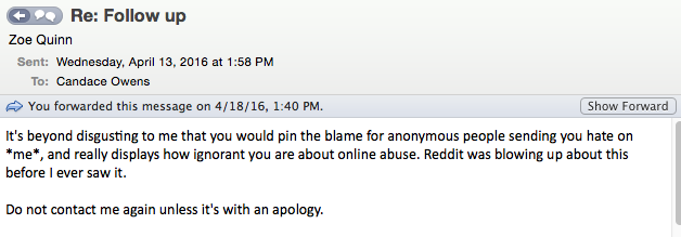 This part was practically insane to me; the fact that she thought that with a simple phone call, I would drop something that I had sank thousands of dollars of personal investment and hard work into, just because Zoe Quinn said so. Her suggestion was ego-manaical.
